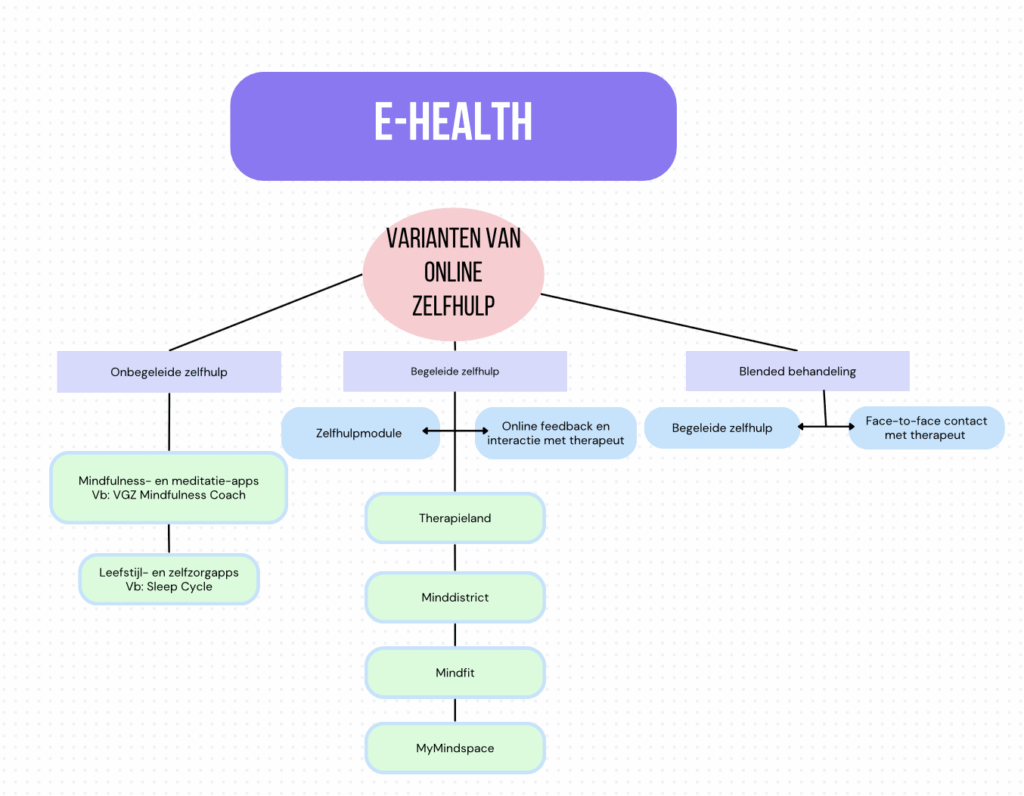 E-health kan ten slotte op diverse manieren worden toegepast binnen de zorg; als onbegeleide zelfhulp, begeleide zelfhulp met onlinefeedback of als blended behandeling waarbij face-to-face- (of videobel)sessies worden afgewisseld met online zelfhulpmodules.